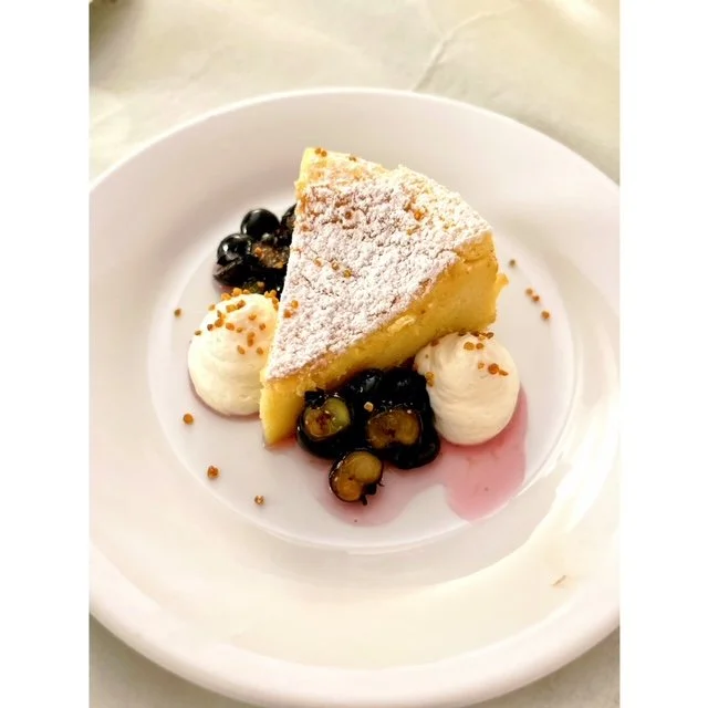 White Chocolate & Tahini Torte with Macerated Blueberries, Honey Whipped Cream & Bee Pollen
