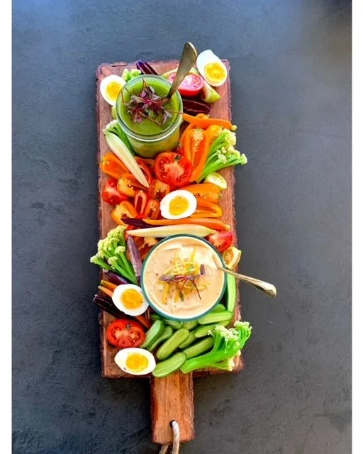 Gnosh Board with Lemon Garlic Hummus, Avocado Herb Dip, Crudite & Custard Eggs